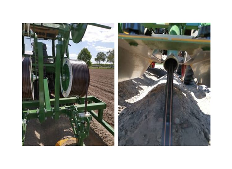 Zo worden er bijvoorbeeld steeds meer druppelsystemen aangelegd in aardappelvelden. Onderstaande foto’s zijn van een project van aardappels voor de procesindustrie. We hebben de volgende inline druppelslang gebruikt: Netafim Streamline – X 16mm 0.35 lt/hr per druppelaar. De druppelaars zijn 30 cm van elkaar vandaag geplaatst. De slang is bovenin de rug geplaatst, voor een optimaal effect van de druppelaar. De druppelslang ligt ca. 4cm diep, hiervoor is gebruik gemaakt van een nieuw frame, wat na het planten kan worden gebruikt. Hierdoor kan het planten met de bestaande apparatuur worden gedaan en kan op een later moment de tape erin worden getrokken. Dit geeft dus een mooie spreiding van de arbeid.