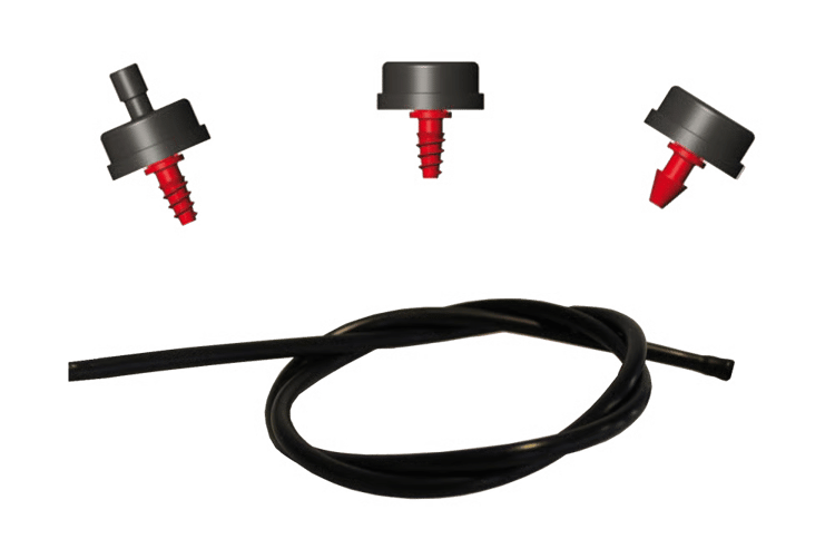 Voorgemonteerde sets met niet-drukgecompenseerde potpecker of inschroef druppelaar voor uniforme watergift in potten, zakken of bakkenteelten.